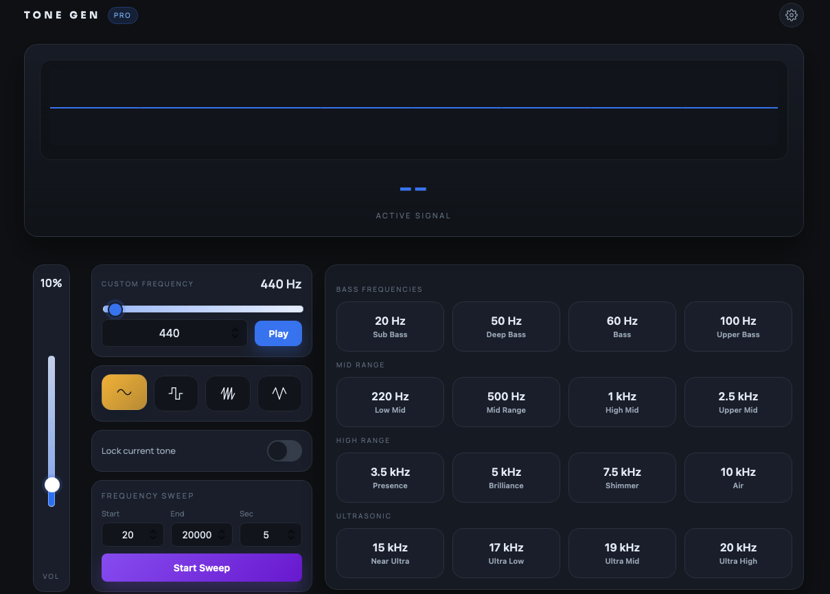 A clean, accurate frequency generator built for testing speakers, tuning systems, calibrating audio gear, and diagnosing playback issues. Sweep through low, mid, and high ranges with ease to evaluate acoustic spaces or troubleshoot audio anomalies. Perfect for audio engineers and post-production workflows.